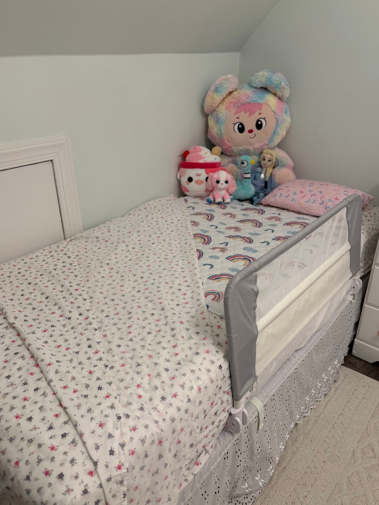 Bed rail: Non-negotiable for active sleepers. For my older daughter, we had one on the side and one at the foot of the bed until she got used to her twin bed. For my younger daughter, we use a fold-down bed rail that makes sheet changes much easier—no wrestling with a cumbersome rail.